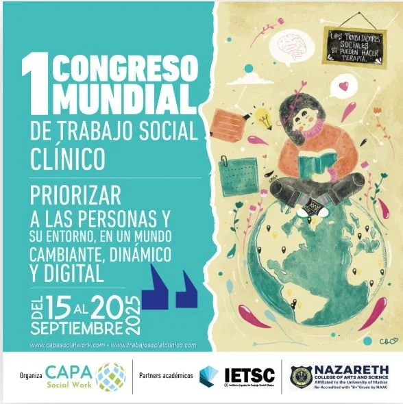 Ilustración de una niña sentada sobre un globo terráqueo leyendo un libro, rodeada de símbolos y objetos relacionados con el trabajo social clínico. Texto promocional para el Congreso Mundial de Trabajo Social Clínico, del 15 al 20 de septiembre de 2025.